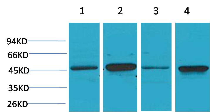 Western blot analysis of 1) Mouse Brain Tissue, 2)Mouse Heart Tissue, 3)Rat Brain Tissue, 4)Rat Heart Tissue with GSK 3β Rabbit pAb EA169 diluted at 1:2,000.